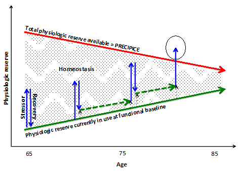 For learners, homeostenosis demonstrates how physiologic aging, illnesses, geriatric syndromes (e.g. congestive heart failure, COPD, falls, multimorbidity, polypharmacy, delirium, etc), and the social determinants of health (e.g., poverty, education) can increase an older adult’s vulnerability by impacting the slopes of either the red and green arrows. Physiologic concepts associated with aging, such as sarcopenia, and the natural aging of all organ systems are inherently embedded in the red, downward sloping arrow. Chronic illnesses, like end-stage COPD or CHF, or multimorbidity would increase the slope of the green arrow (i.e. increase the baseline metabolic requirement). Furthermore, a learner can better appreciate the importance of learning about how evidence-based preventive measures could effectively increase the distance between the two arrows. Promoting immunizations, nutrition, and exercise guidelines2-5 becomes much more relevant to the clinician and learner when seen through this lens.