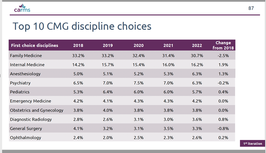 - note 5 year decline of students interested in Family Medicine as first choice discipline
