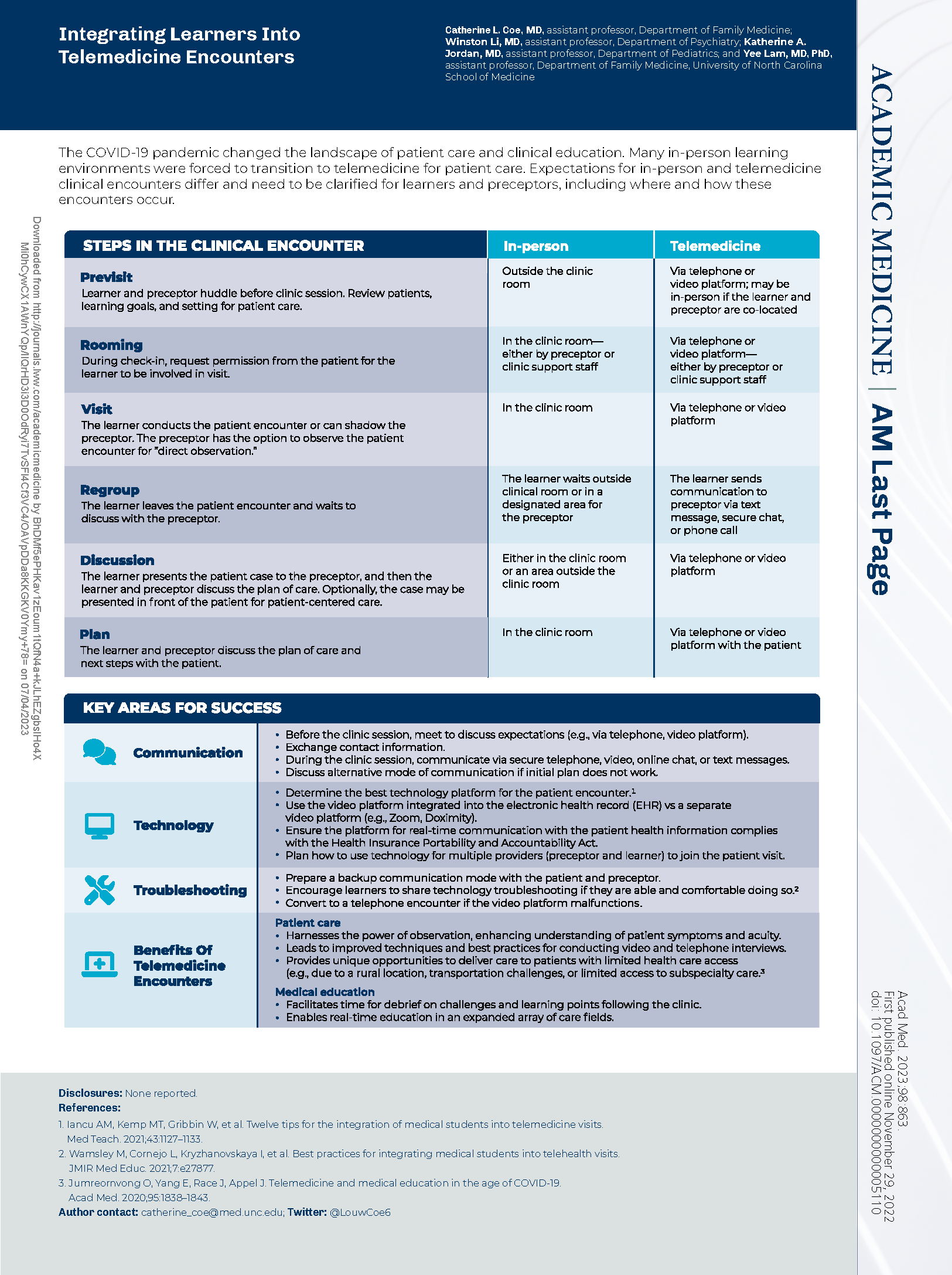 Coe CL, Li W, Jordan KA, Lam Y. Integrating Learners Into Telemedicine Encounters. Acad Med. 2023 Jul 1;98(7):863. doi: 10.1097/ACM.0000000000005110. Epub 2022 Nov 29. PMID: 36512811.