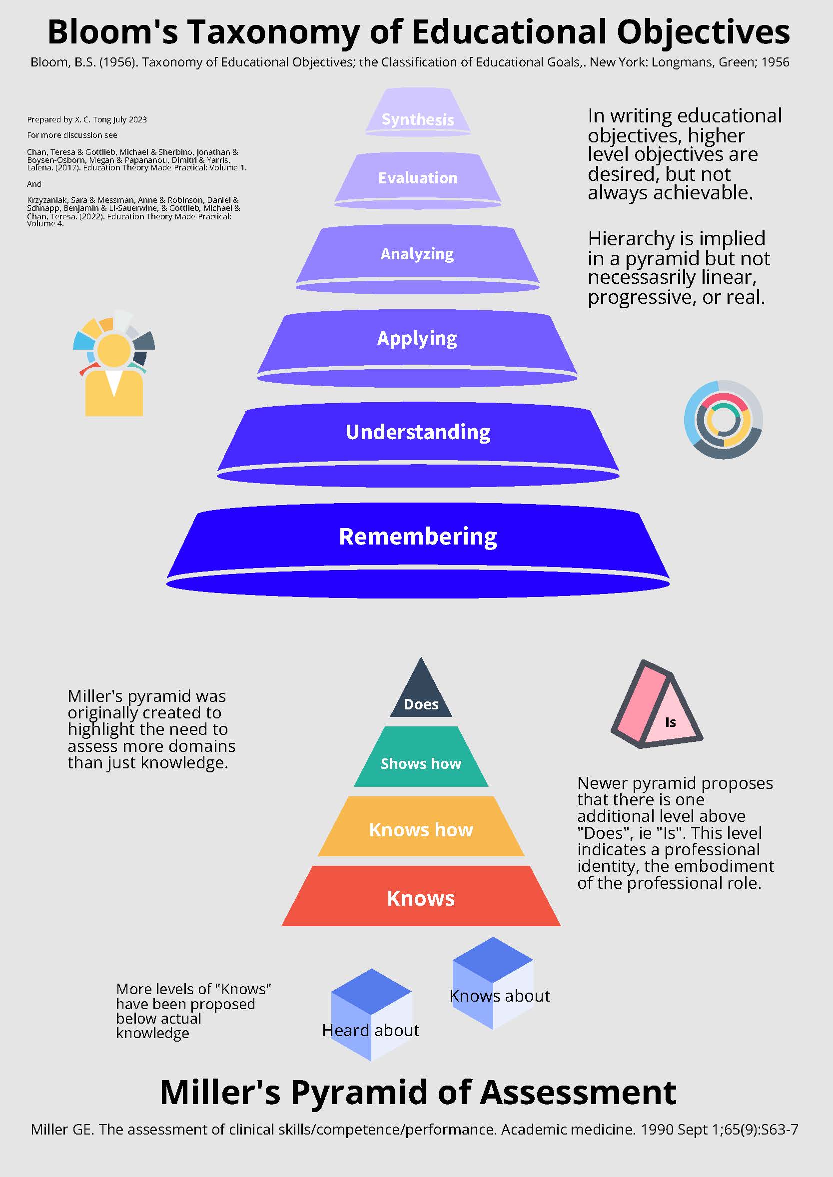 Summary: Blooms taxonomy is a tool that helps to both understand and inform the learning process. Millers pyramid provides a step-wise approach to clinical teaching and a framework for learner assessment. The graphic below highlights both in a snappy, digestible format.
