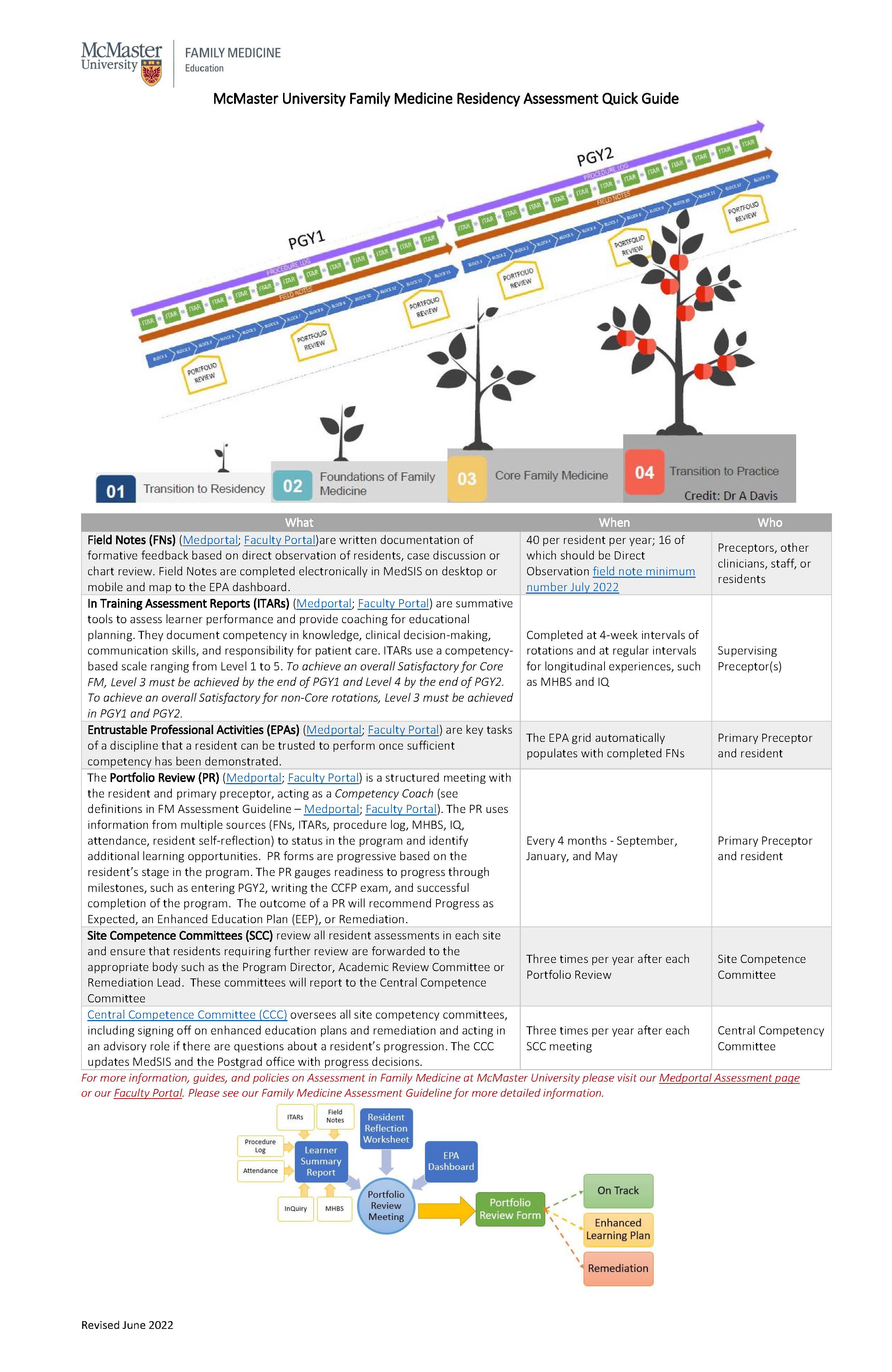 - Residency Assessment Quick Guide (https://mcmasteru365.sharepoint.com/sites/FacultyRelations2/PG%20Resources/Forms/AllItems.aspx?id=%2Fsites%2FFacultyRelations2%2FPG%20Resources%2FResidency%20Assessment%20Quick%20Guide%5FJK%5Frev%5F05%2D27%2D2022%2Epdf&parent=%2Fsites%2FFacultyRelations2%2FPG%20Resources)