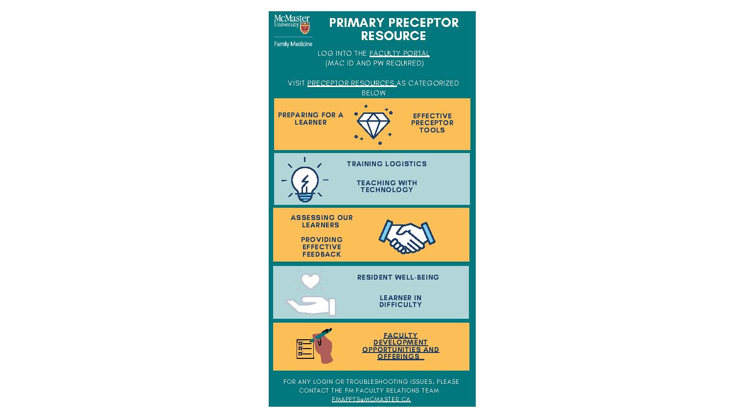 A primary preceptor is the resident’s clinical coach, competency coach, and career advisor throughout their two-year Family Medicine residency. Their practice serves as a resident’s home base, and their mentorship is foundational to each learners’ development. The infographic and resource “quick links” below are offered to support faculty in their educational roles and core responsibilities, ensuring an effective and meaningful experience for both preceptor and learner! Return to these resources on a regular basis, to catch the updates and see what’s new!