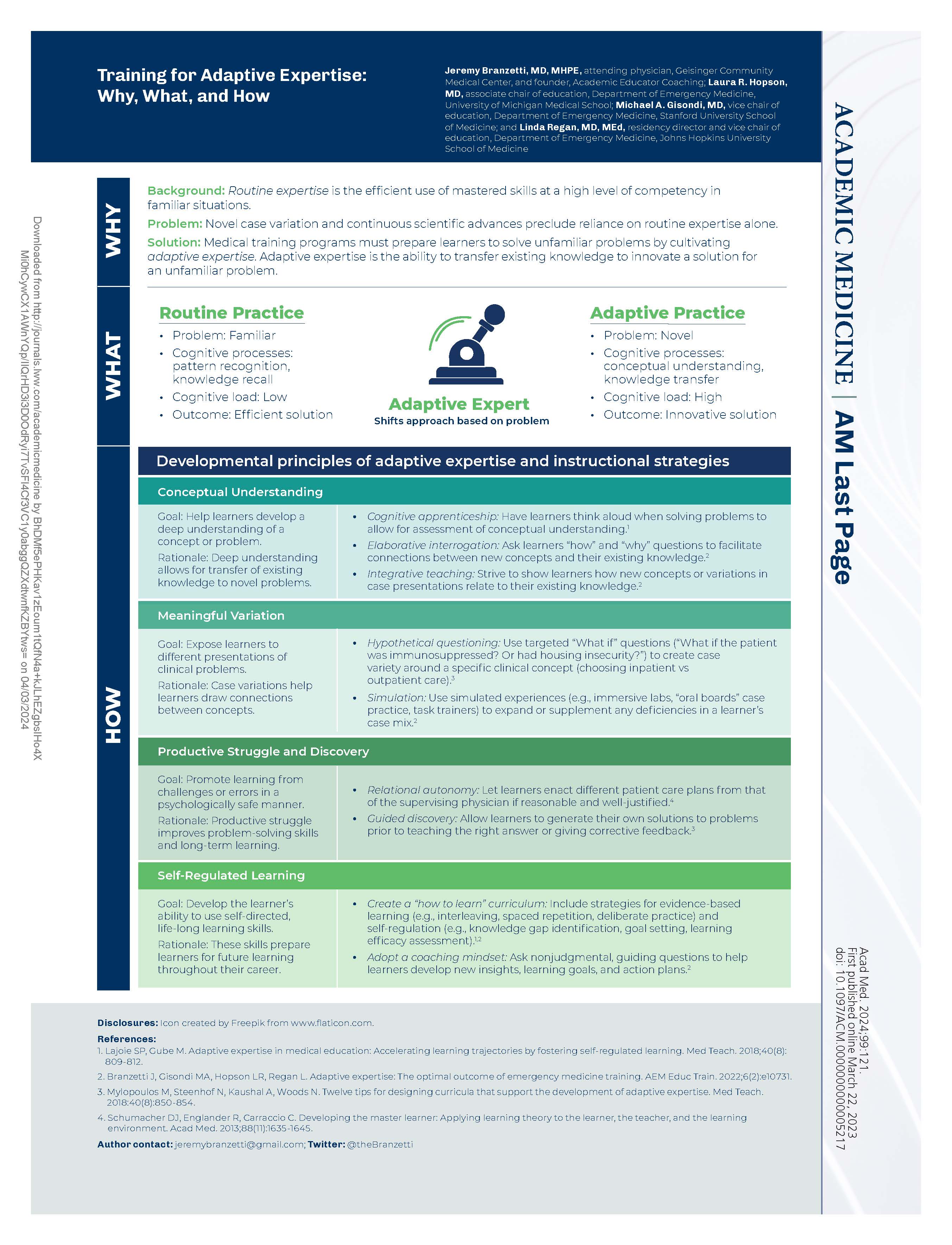 2-Branzetti, Jeremy MD, MHPE; Hopson, Laura R. MD; Gisondi, Michael A. MD; Regan, Linda MD, MEd. Training for Adaptive Expertise: Why, What, and How. Academic Medicine 99(1):p 121, January 2024. | DOI: 10.1097/ACM.0000000000005217